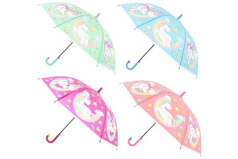 Vystřelovací deštník s motivy jednorožců. Rozměry rozloženého deštníku cca 83,5 x 83,5 x 66 cm. Rozměry balení cca 66 x 9,5 x 4 cm. Baleno v igelitovém sáčku.