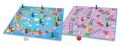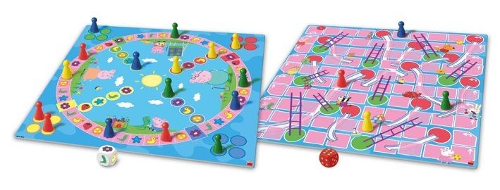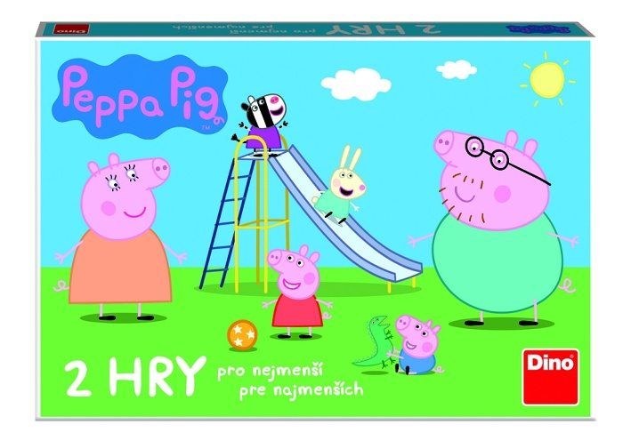 2 oblíbené hry pro nejmenší s prasátkem Peppa a její rodinou. Hra POJĎ SI HRÁT s pravidly jako u „Člověče nezlob se “. Hrací kostka však má místo bodů obrázky, které jsou na políčkách herního plánu. Hru tak mohou hrát děti, které ještě neumí počítat. V klasické hře ŽEBŘÍKY A SKLUZAVKY, je cílem dojít se svojí figurkou co nejrychleji do cíle. Během hry můžete využívat žebříků jako zkratek. Ovšem běda, když šlápnete na skluzavku. Ani se nenadějete a sklouznete po ní dolů. Hrou si děti procvičují základní počítání, pozornost a soutěživost. Popis hry Pojď si hrát: CÍL HRY Úkolem každého hráče je obejít se 4 figurkami své barvy celý herní plán a dojít s nimi do „domečku“ stejné barvy. Hru vyhrává hráč, který své figurky dovede do domečku jako první. PŘÍPRAVA HRY Na začátku hry si každý hráč vezme 4 figurky jedné barvy. Jednu figurku postaví hráč ihned na startovní políčko své barvy. Zbylé figurky umístí na políčka odpovídající barvy do zásobníku. PRŮBĚH HRY Hru začíná nejmladší hráč. Hráči se ve hře pravidelně střídají po směru hodinových ručiček. První hráč hodí kostkou a postoupí na nejbližší políčko se symbolem, který mu padl na kostce. Padne-li hráči na kostce symbol shodný se symbolem na startovním políčku, může se rozhodnout, zda nasadí do hry další svoji figurku ze zásobníku nebo zda bude pokračovat ve hře s některou z figurek, které má již ve hře. Vyhození figurky: Končí-li tah hráče na políčku obsazeném jinou figurkou, hráč tuto figurku vyhodí a postaví ji zpět do jejího zásobníku. Svoji figurku pak postaví na uvolněné políčko. KONEC HRY Poté, co hráči obejdou s figurkami celé kolo, pokračují do „domečku“. Hráč může vstoupit do domečku pouze tehdy, padne-li mu na kostce symbol shodný se symbolem na volném políčku v domečku. Hráči mohou posouvat figurky uvnitř domečku stejným způsobem jako při hře, mají-li k tomu místo. Do domečku nesmí vstoupit žádná figurka jiné barvy a figurky se zde ze hry nevyhazují. Popis hry Skluzavky: CÍL HRY Cílem hry je dojít svojí figurkou co nejrychleji ze startovního políčka do cíle. PŘÍPRAVA HRY Hru začíná nejmladší hráč. Dále pokračují ve hře hráči po směru hodinových ručiček. Na začátku hry si každý hráč vybere figurku své barvy a figurky postaví na políčko START. PRŮBĚH HRY První hráč hodí kostkou a postoupí dopředu ve směru šipky o tolik polí, kolik bodů padlo na kostce. Postupně hází kostkou další hráči a postupují po herním plánu podle směru šipek. Na jednom políčku smí stát libovolný počet figurek. Žebříky: Končí-li hráčův hod na zeleném políčku, kde začíná žebřík, ihned postoupí vzhůru na jeho konec. V dalším hodu postupuje ve směru šipek. Skluzavky: Končí-li hráčův hod na červeném políčku, kde začíná skluzavka, ihned po ní sjede až dolů. V dalším hodu postupuje ve směru šipek opět směrem k cíli. KONEC HRY Vyhrává ten hráč, který jako první dosáhne políčka CÍL v levém horním rohu plánu. Na toto políčko je třeba trefit se přímým hodem. Obsahuje: • 1 oboustranný herní plán • 16 figurek ve 4 barvách • 1 obrázková hrací kostka • 1 bodová kostka • 1 pravidla