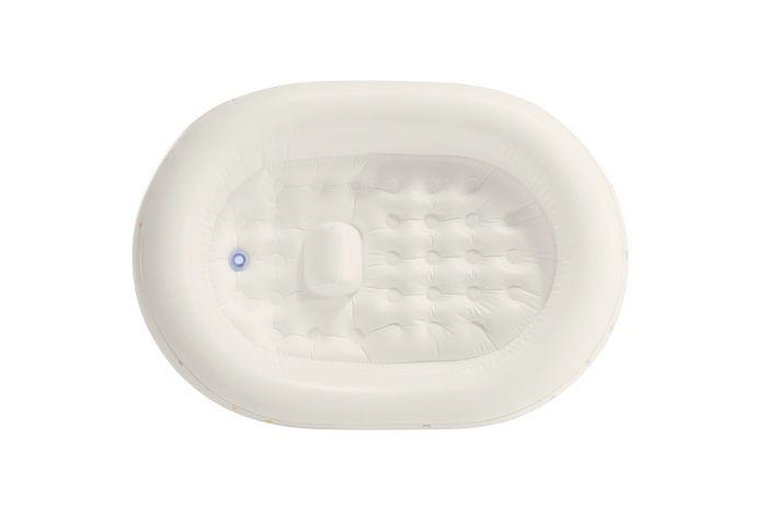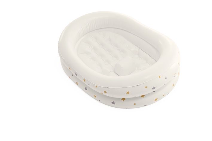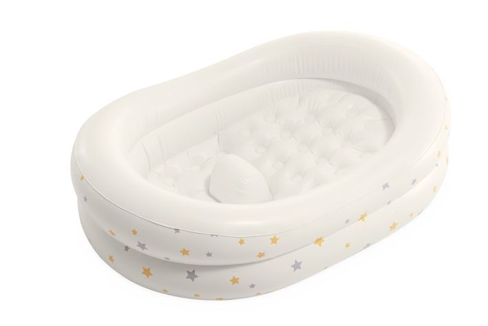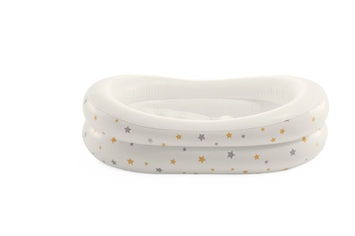 Dětská nafukovací vanička Starry je navržena tak, aby poskytovala bezpečné a komfortní prostředí pro koupání nejmenších dětí. Vanička má oválný tvar s dostatečně prostorným vnitřkem, který je vyroben z měkkého a příjemného materiálu, jenž je šetrný k citlivé dětské pokožce. Povrch vaničky je bílý s jemným potiskem hvězdiček v odstínech zlaté a šedé, což jí dodává hravý a zároveň elegantní vzhled. Vnitřní část vaničky je opatřena nafukovacím podpůrným výstupkem, který je umístěn tak, aby zabránil sklouznutí miminka během koupání. Dno je rovněž nafukovací a díky své mírné strukturovanosti poskytuje dodatečný komfort a stabilitu. Díky těmto prvkům je koupání bezpečné a pohodlné jak pro dítě, tak i pro rodiče, kteří mohou mít jistotu, že jejich dítě je dobře podepřeno. Vanička je velmi lehká a snadno přenosná, což ocení rodiče při cestování nebo při přenášení mezi místnostmi. Součástí balení je ruční pumpa, která usnadňuje nafouknutí i vyfouknutí vaničky, což výrazně zjednodušuje její přípravu a údržbu. Celkově je tato nafukovací vanička vhodná pro venkovní i domácí použití, zejména v letních měsících, kdy může sloužit jako praktická alternativa ke klasickým dětským vaničkám.