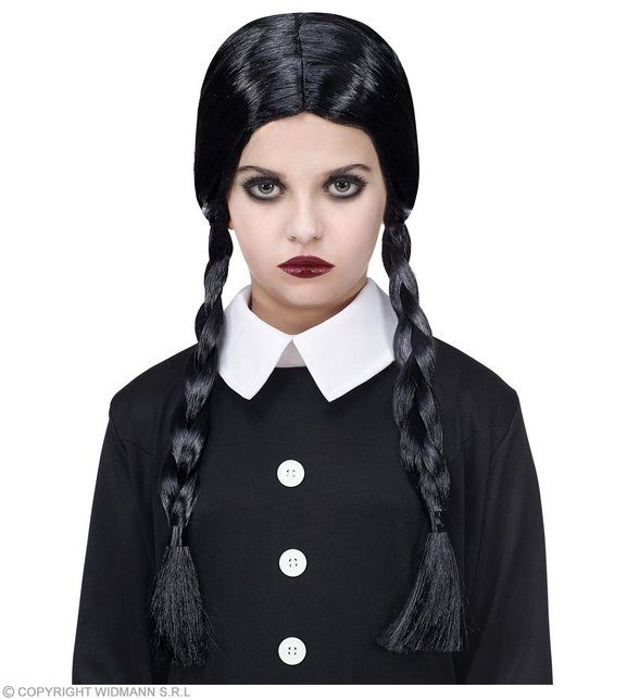 Černá rovná paruka pro dívky s pěšinkou uprostřed a copánky, stejně jako má Wednesday z Addamsnových.