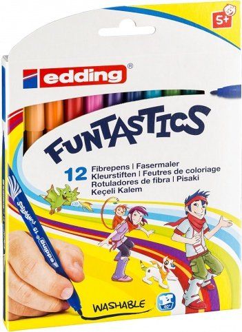 Sada dětských fixů edding Funtastics 15 pro spontánní kreativitu. Fixy jsou vhodné především na světlý papír. Inkoust na vodní bázi rychle schne, je snadno vypratelný z většiny textilií a má neutrální vůni. Protiskluzový úchop pro lepší držení fixu. Speciální inkoust zabraňuje vyschnutí, pokud je popisovač ponechán bez víčka. Navrženo ve spolupráci s pedagogy. Kulatý hrot. Šíře stopy: 1 mm. Sada obsahuje 12 barev: černá, červená, modrá, zelená, žlutá, oranžová, hnědá, fialová, růžová, světle modrá, světle zelená, broskvová. Výrobek odpovídá CE požadavkům na dětské hračky. Upozornění: obsahuje malé části - nevhodné pro děti mladší 3 let. Vyrobeno v Německu.