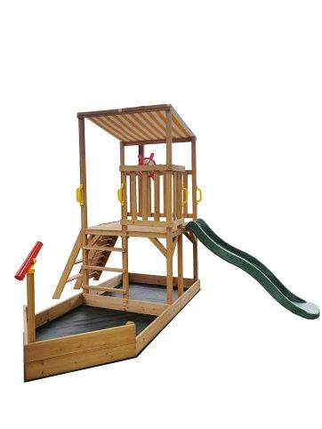 Součástí balení je dále kormidlo, teleskop, žebřík, lezecká stěna, provazová stěna, skluzavka dlouhá 180 cm.