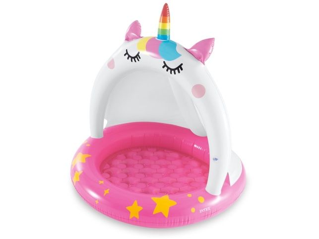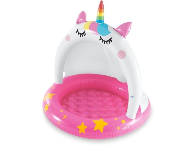 INTEX 58438NP Dětský bazének jednorožec se sluneční ochranou 1,02 m x 1,02 m. Nafukovací bazén vetvaru jednorožce a s ochranou proti sluníčku dopřeje osvěžení v parných letních dnech i těm nejmenším. Stříška pomůže ochránit dítě před přímými slunečními paprsky. Výhodou bazénu je jednoduchá instalace. Stačí rozložit bazén na hladkou vodorovnou a dostatečně stabilní plochu, nafouknout a napustit vodu. Stěny bazénu jsou vyrobeny ze zdravotně nezávadného vinylu o tloušťce 0,25 mm. Objem vody cca 45 l při výšce vody 13 cm. Výrobky značky Intex splňují nejpřísnější bezpečnostní normy na zpracování a použité materiály. Balení obsahuje opravnou sadu. Nafukovací bazény vám zaručí příjemné osvěžení v pohodlí vašeho domova. Letní vedra pro vás přestanou být problém!Vyzkoušejte krásný dětský bazén s měkkou nafukovací podlahou v motivu jednorožce. Rozměry: 102 x 102 cm. Kapacita vody 45 litrů při hloubce vody 13 cm. Materiál: vinyl ( 0,25 mm ). Vhodné pro děti 1 - 3 roky. Sada na opravu je součástí.