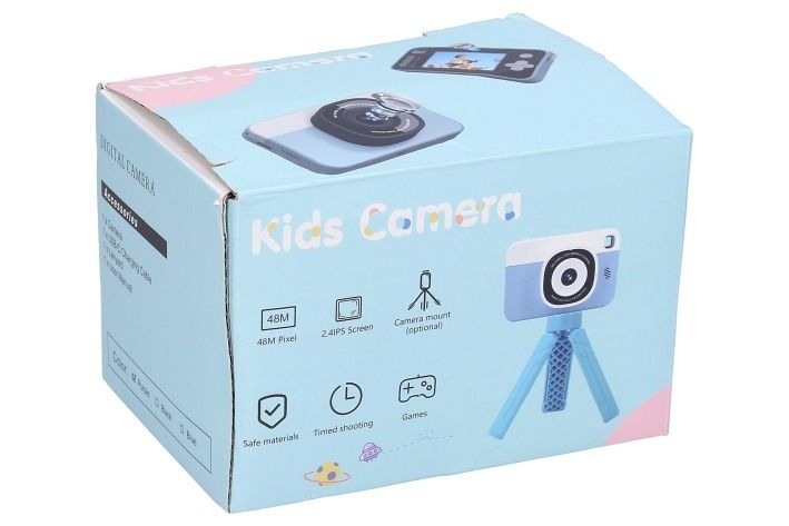 Dětský digitální fotoaparát silikonové pouzdro dino stativ - foto 48Mpx, video Full HD. Rozměry 10x4,5x7 cm. Silikonové pouzdro a stativ součástí. Rozlišení fotografií 48 megapixelů, videa Full HD (1920x1080). Selfie kamera, časovač 10s/5s/2s, vložení času, 4x digitální zoom, různé efekty (rámečky, vložené animace, deformace, filtry) fotografií, hry, mp3 přehrávač, 2,4 palcový displej. Vestavěná 400mAh Li-ion baterie, USB-C kabel a popruh součástí. Formát fotografií jpg, videa avi.