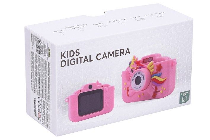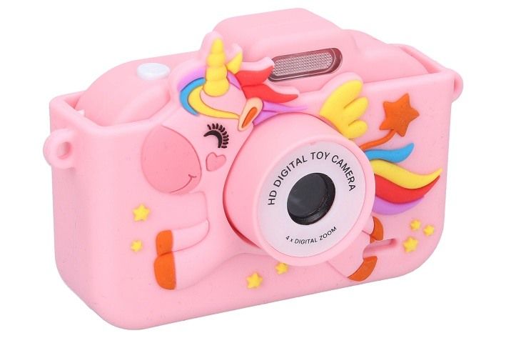 Dětský digitální fotoaparát silikonové pouzdro jednorožec - foto 48Mpx, video Full HD. Rozměry 10,3x4x6,7 cm. Silikonové pouzdro součástí. Rozlišení fotografií 48 megapixelů, videa Full HD (1920x1080). Blesk, selfie kamera, časovač 10s/5s/2s, vložení času, 4x digitální zoom, různé efekty (rámečky, vložené animace, deformace, filtry) fotografií, hry, mp3 přehrávač, 2,0 palcový displej. Vestavěná 400mAh Li-ion baterie, USB-C kabel a popruh součástí. Formát fotografií jpg, videa avi.