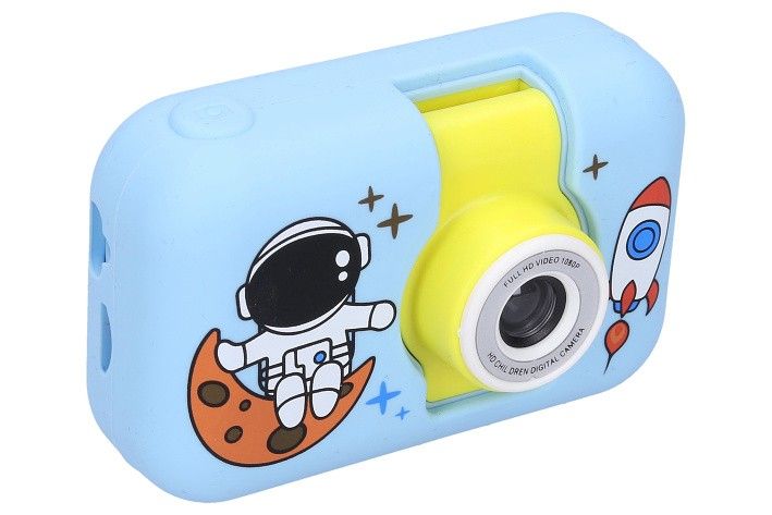 Dětský digitální fotoaparát výklopný objektiv silikonové pouzdro Kosmonaut - foto 40Mpx, video Full HD. Rozměry 9,6x4,2x6,3 cm. Silikonové pouzdro součástí. Rozlišení fotografií 40 megapixelů, videa Full HD (1920x1080). Výklopný objektiv pro selfie foto, časovač 10s/5s/2s, vložení času, 4x digitální zoom, různé efekty (rámečky, vložené animace, deformace, filtry) fotografií, hry, mp3 přehrávač, 2,0 palcový displej. Vestavěná 400mAh Li-ion baterie, USB-C kabel a popruh součástí.