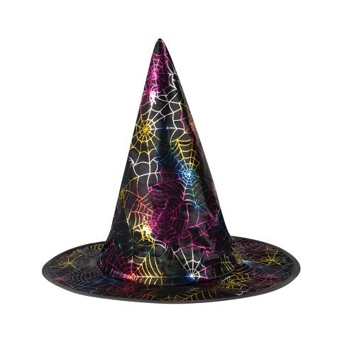 Veselý halloweenský klobouk je skvělým doplňkem na besídku nebo karneval! Klobouk černé barvy je zdoben barevnou pavučinkou.