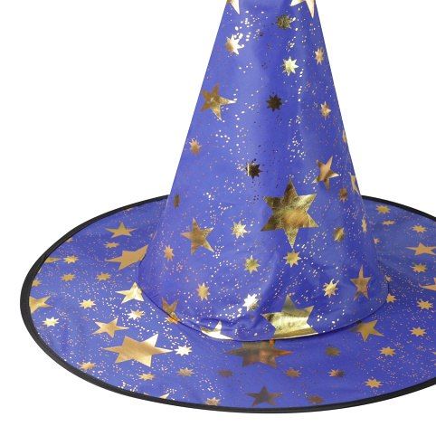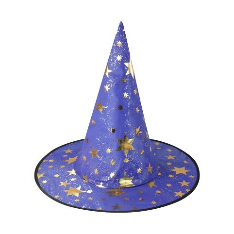 Úžasný čarodějnický klobouk v modré barvě s potiskem zlatých hvězdiček. Ideální i na halloweenský večírek nebo karneval!