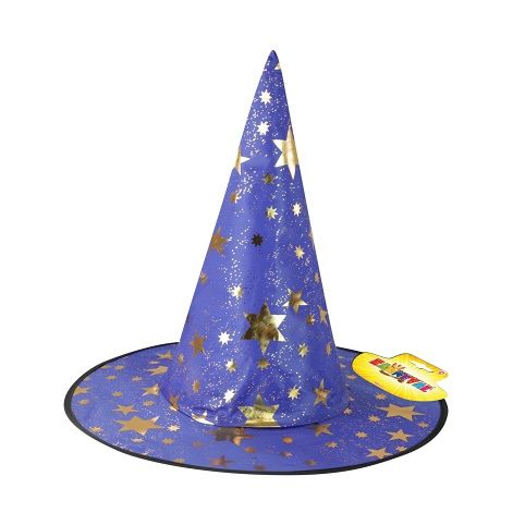 Úžasný čarodějnický klobouk v modré barvě s potiskem zlatých hvězdiček. Ideální i na halloweenský večírek nebo karneval!