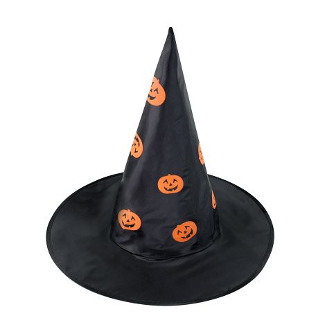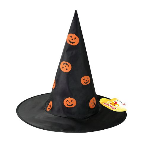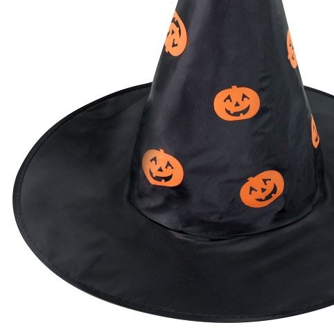 Úžasný čarodějnický klobouk v černé barvě s potiskem oranžových dýní. Ideální na halloweenský večírek nebo karneval!