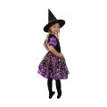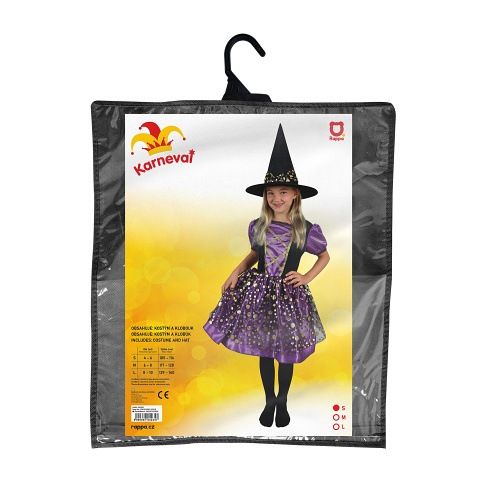 Nádherný kostým na Halloween pro všechny malé čarodějnice! Kostým fialovo-černé barvy ve velikosti S je určen pro holčičky ve věkovém rozmezí 4-6 let (105-116 cm). Šaty jsou dekorovány zlatým potiskem. Součástí kostýmu je perfektně sladěný čarodějnický klobouk. S tímto úchvatným kostýmem se zaručeně staneš hvězdou karnevalu i Halloweenu!