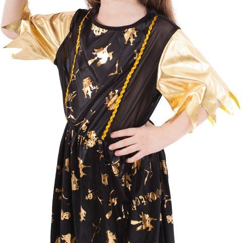 Halloweenský kostým pro malé čarodějnice! Kostým černo-zlaté barvy ve velikosti M je určen pro holčičky ve věkovém rozmezí 6-8 let (117-128 cm). Šaty jsou dekorovány zlatými halloweenskými motivy. Součástí kostýmu je perfektně sladěný čarodějnický klobouk. S tímto úchvatným kostýmem se zaručeně staneš hvězdou karnevalu i Halloweenu! Nejen letos je potřeba myslet EKO-nomicky i EKO-logicky! EKO-balení je vhodné zejména pro e-shopy kde zákazník nakupuje dle fotografie a není třeba velkého balení s věšákem. EKO-logicky – na balení bylo použito méně plastu a dalších materiálů. Jedná se o malý transparentní obal s fotografií. EKO-nomicky –EKO-obal zabere jen polovinu místa – šetřete skladová místa s námi!