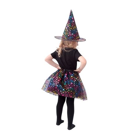 Magický kostýmek pro malé čarodějnice v černé barvě, zdobený barevným dekorem hvězdiček. Kostým je určen pro holčičky ve věkovém rozmezí 3-7 let. Balení obsahuje nadýchanou sukničku a k tomu perfektně sladěný klobouk. Délka sukýnky je cca 30 cm. Sukně je v pase na gumičku. Vhodný i na oslavu Halloweenu.