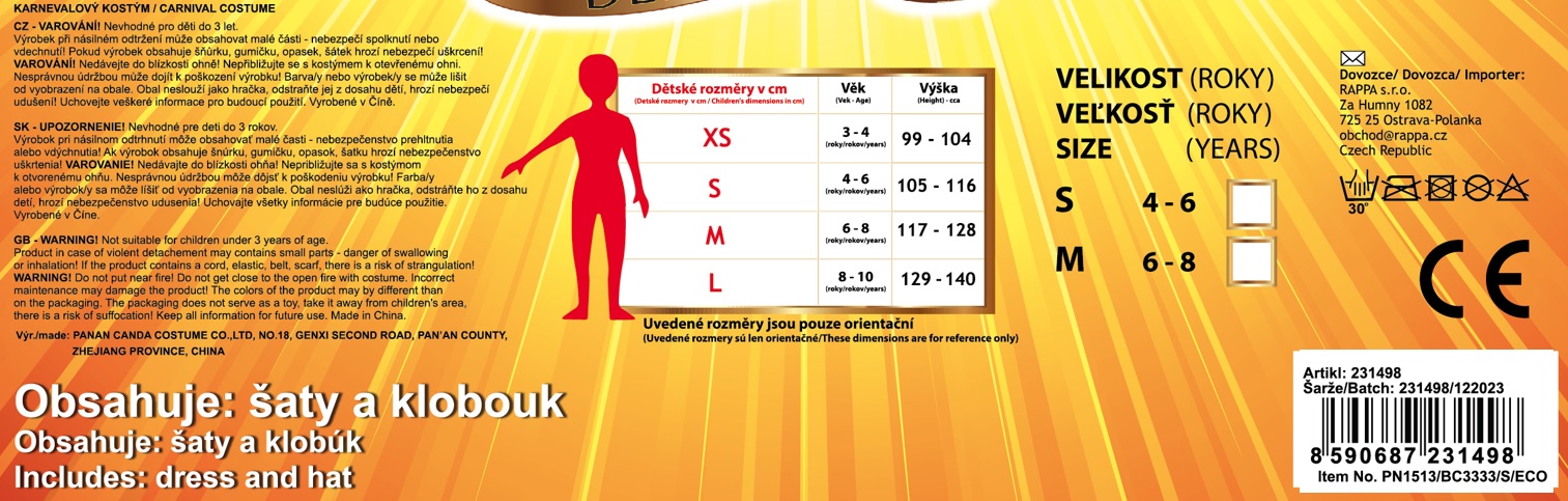 Nádherný kostým na Halloween pro všechny malé čarodějnice! Kostým růžovo-černé barvy ve velikosti S je určen pro holčičky ve věkovém rozmezí 3-6 let (105-116 cm). Šaty jsou dekorovány potiskem kočiček a netopýrů. Součástí kostýmu je perfektně sladěný čarodějnický klobouk. S tímto úchvatným kostýmem se zaručeně staneš hvězdou karnevalu i Halloweenu! Nejen letos je potřeba myslet EKO-nomicky i EKO-logicky! EKO-balení je vhodné zejména pro e-shopy kde zákazník nakupuje dle fotografie a není třeba velkého balení s věšákem. EKO-logicky – na balení bylo použito méně plastu a dalších materiálů. Jedná se o malý transparentní obal s fotografií. EKO-nomicky –EKO-obal zabere jen polovinu místa – šetřete skladová místa s námi!