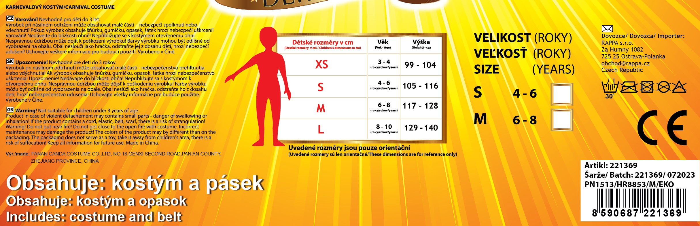 Kostým pro malé čarodějnice! Kostým černé barvy ve velikosti M je určen pro holčičky ve věkovém rozmezí 6-8 let (116-128 cm). Šaty jsou dekorovány průhlednými rukávy s motivem pavučin. S tímto úchvatným kostýmem budeš vypadat jako pravá čarodějka!