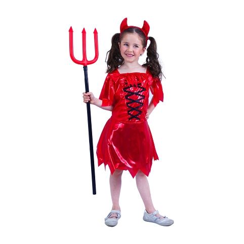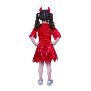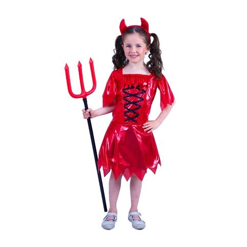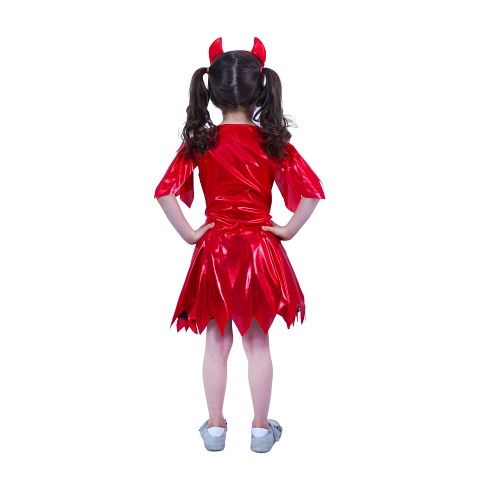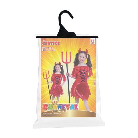 Pekelný karnevalový kostým s motivem čertice v červené barvě, ve velikosti M je určen pro holčičky ve věkovém rozmezí 6-8 let (116-128 cm). Balení obsahuje šaty a čelenku s rohama.