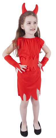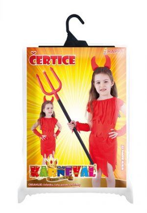 Pekelný karnevalový kostým s motivem čertice v zářivé červené barvě ve velikosti M je určen pro holčičky ve věkovém rozmezí 6-8 let (116-128cm). Balení obsahuje šaty, čelenku s rohy, návleky na ruce a pásek.