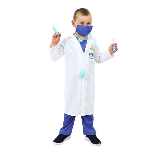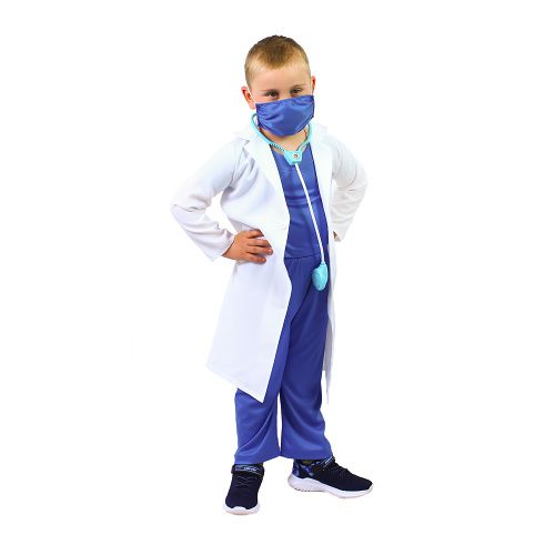 Kdo by si jako malý nehrál rád na doktora? Tento doktorský kostým je k tomu jako stvořený! Kostým ve velikosti M je určen pro děti ve věku 6-8 let (116-128 cm). Set obsahuje bílý doktorský plášť, modré tričko i kalhoty, roušku a různé lékařské vybavení.