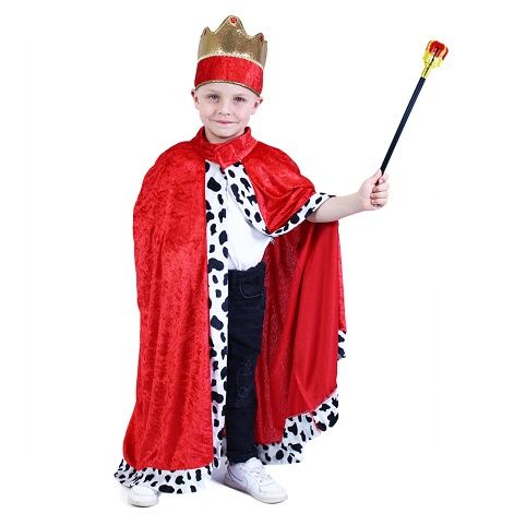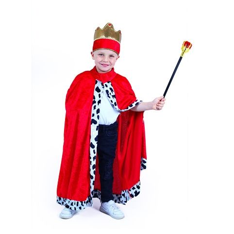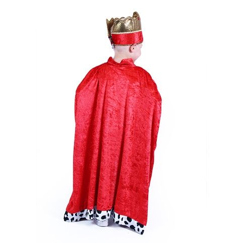 Královský plášť je perfektním doplňkem na karneval! Sametový plášť červené barvy je dekorován honosným hermelínem a v přední části jej lze uchytit na suchý zip. Součástí je i královská koruna zdobená červenými safíry. Tento stylový kousek je určen pro děti ve věkovém rozmezí 3-10 let ( 104-110 cm). Senzace!