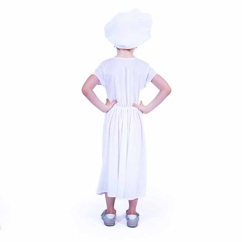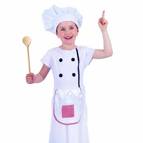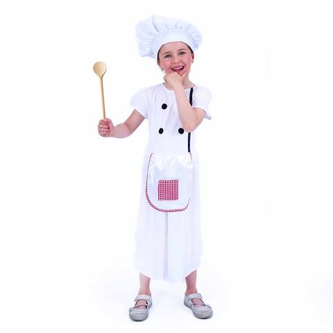 Kostým pro každou vášnivou kuchařku! Šaty jsou zdobeny zástěrou s červeným lemováním, na které je našita malá kapsička. No a co by to bylo za kuchařku bez parádní kuchařské čepice! Set šatů a čepice ve velikosti M je vhodný pro holčičky ve věkovém rozmezí 6-8 let (116-128 cm).