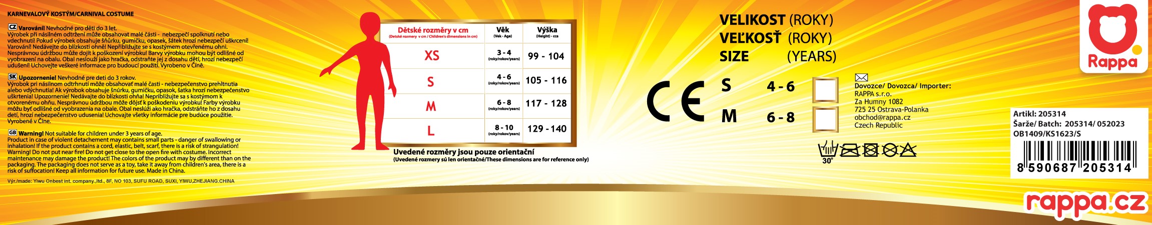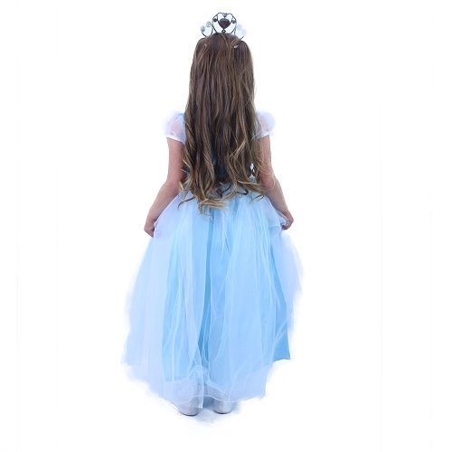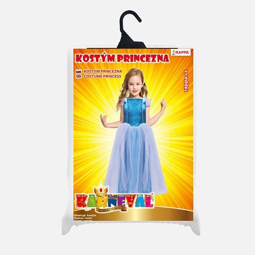 Úchvatný dívčí kostým pro princezny! Kostýmek modré barvy je kombinován s bílým tylem a v horní části dekorován modrými flitry. Kostým princezny ve velikosti S je určen pro holčičky ve věkovém rozmezí 4-6 let (110-116 cm).