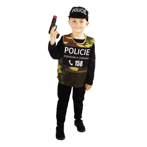 Obleč si kostým a záchranná akce může začít! Kostým policisty obsahuje černý overal, zásahovou maskáčovou vestu s nápisem POLICIE a čepici. Kostým ve velikosti S je určen pro děti ve věkovém rozmezí 4-6 let (110-116 cm).