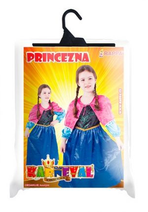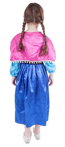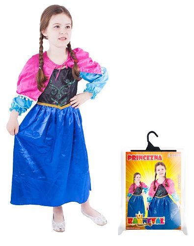 Překrásný dívčí kostým pro všechny sněhové princezny! Kostým ve velikosti S je určen pro holčičky ve věkovém rozmezí 4-6 let (100-116 cm). Velikost se může lišit od vyobrazení na obalu. Kostýmek je ušit v černo-modrých barvách, v horní částí je zdoben potiskem, zlatým lemováním kolem pasu. Součástí je také růžový plášť na mašličku.