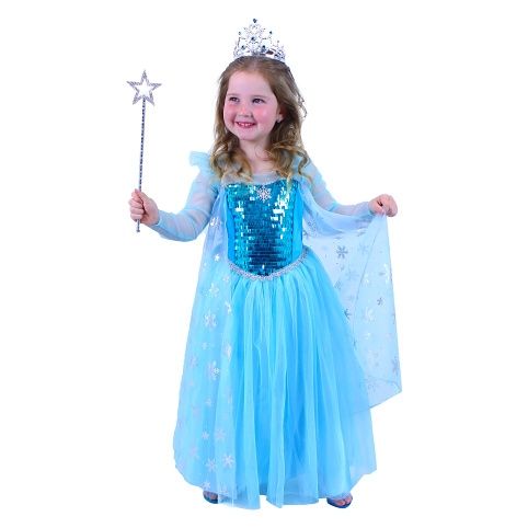 Okouzlující dívčí kostým pro malé zimní princezny! Kostým ve velikosti M je určen pro holčičky ve věkovém rozmezí 6-8 let (116-128 cm). Kostýmek je ušit v tyrkysově modré barvě a je zdoben oslnivými flitry a stříbrným lemováním. Součástí šatů je také plášť dekorován třpytivými sněhovými vločkami.