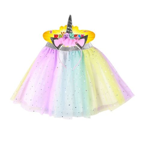 Úchvatná sukýnka TUTU je určena pro holčičky ve věkovém rozmezí 3-7 let. Nadýchaná sukně v duhových barvách je dolněna sříbrnou gumou v pase. Součástí této sady je senzační čelenka jednorožce se sříbrným rohem a barevnými růžemi! Délka sukýnky je cca 30 cm.