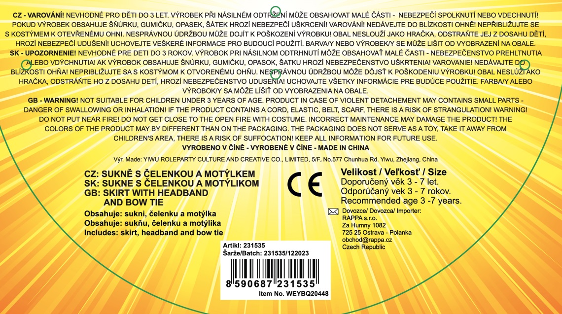 Roztomilý čertovský kostýmek s TUTU sukýnkou je určen pro holčičky ve věkovém rozmezí 3-7 let (104-146 cm), obvod pasu 46-72 cm. Nadýchaná tylová sukýnka s čertovským ocáskem, typické červené barvy je v pase na gumu. Součástí této sady je senzační čelenka s rohy a motýlek na krk! Délka sukýnky je cca 40 cm.