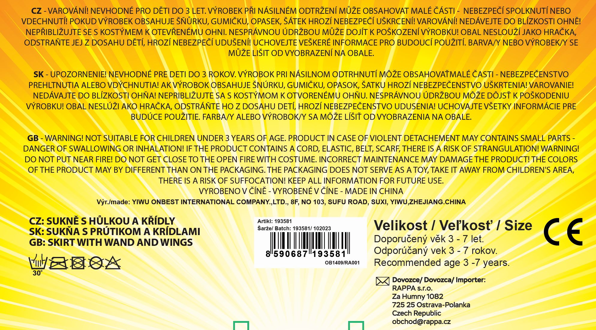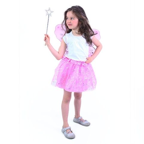Krásná vílí sada pro malé holčičky! Sada obsahuje křídla se stříbrným zdobením, růžovou TUTU sukýnku se saténovým lemem a stříbrným potiskem hvězd a měsíčků. Celý set doplňuje vílí kouzelnická hůlka. Sukně je dlouhá cca 25 cm a je vhodná pro obvod pasu 44-72 cm.