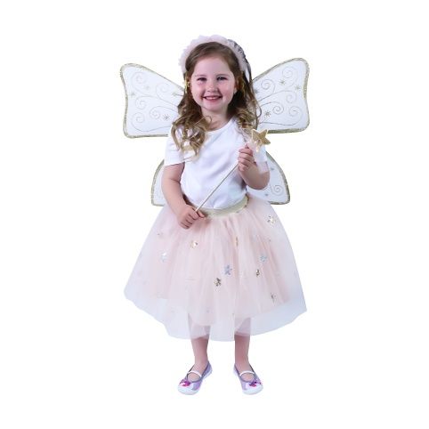 Krásná vílí sada pro malé holčičky! Sada obsahuje křídla se zlatým potiskem, nadýchanou sukýnku s tylem, který je zdobený stříbrnými a zlatými hvězdičkami. Celý set doplňuje vílí kouzelnická hůlka a čelenka do vlasů. Sukně je v pase na gumu a dlouhá cca 34 cm. Nejen letos je potřeba myslet EKO-nomicky i EKO-logicky! EKO-balení je vhodné zejména pro e-shopy kde zákazník nakupuje dle fotografie a není třeba velkého balení s věšákem. EKO-logicky – na balení bylo použito méně plastu a dalších materiálů. Jedná se o malý transparentní obal s fotografií. EKO-nomicky –EKO-obal zabere jen polovinu místa – šetřete skladová místa s námi!