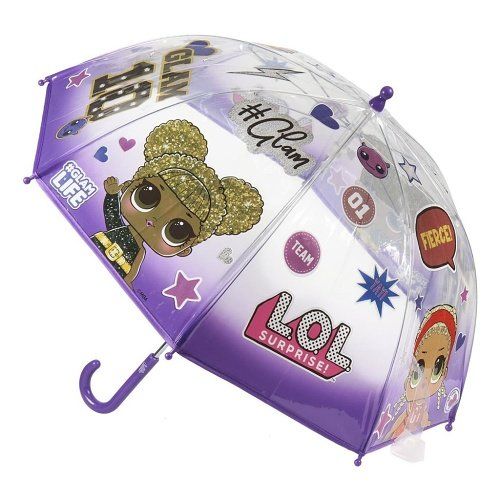 Dětský deštník L.O.L průsvitný fialový. Deštník otevíráme i zavíráme manuálně. Velikost deštníku 45×71 cm. Vyrobeno ve Španělsku.