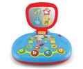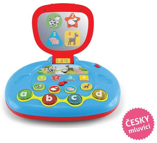 Dětský počítač - mluví česky. Rozměry 20x16 cm. Světelné a zvukové efekty. 3xAA baterie součástí. Promítání (displej) v zrcátku. Přepínač - vypnuto, nižší, vyšší hlasitost. Výuka čísel, barev, písmen, tvarů, zvuky zvířátek, melodie (nota).