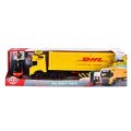 Nákladní vůz DHL Volno FH 16 na setrvačník se světelnými a zvukovými efekty a pohyblivými díly. Součástí kontejnerový příves a vysokozdvižný vozík na volnoběh, 12 cm. Délka 35 cm, barva žlutá/červená.