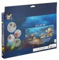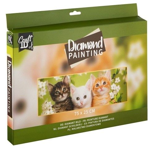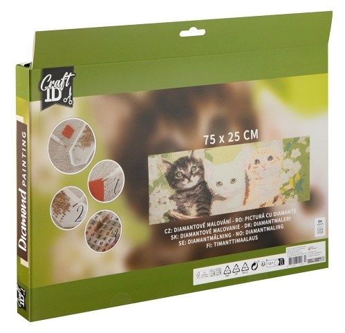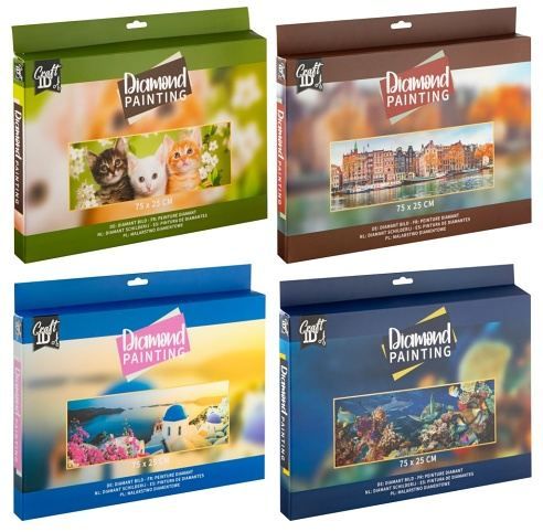 Pusťte se do tvorby detailního mozaikového obrazu pomocí techniky Diamond malování. Výsledná obrázek má velikost 75×25 cm. Sada obsahuje plátnos předtištěným vzorem a speciální lepící vrstvou, sadu barevných kamínků, aplikační pero, vosk a misku na kamínky. Ve čtyřech vzorech – koťátka, holandské město, podmořský svět a řecké moře.