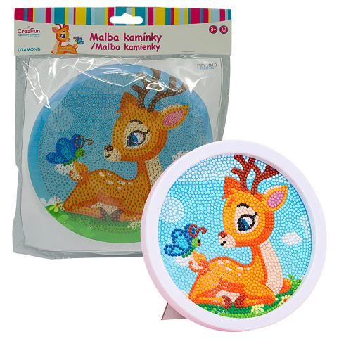Vytvořte si krásný obrázek z barevných kamínků. Obsah: kamínky různých barev, pero pro přenos kamínků, tácek, vosk do pera, obrázek-plátno s plastovým rámem. Postup: Obrázek je zakrytý ochrannou folií, kterou sundáváte postupně, tak jak budete aplikovat kamínky. Při sundání celé folie najednou hrozí, že se ztratí viskozita lepidla a kamínky nebudou držet. Plátno obsahuje označení, která jsou umístěna i na sáčcích s kamínky. Podle označení, víte kam který kamínek patří. Nejprve si do hrotu pera naberete vosk, díky kterému se kamínky snadno přichytí na pero. Kamínky perem aplikujte na obrázek. Rozměr obrázku: průměr 17cm