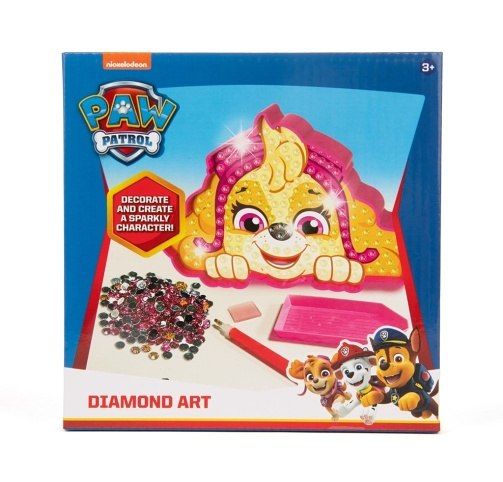 Diamantové malování Tlapková patrola Skye – balení obsahuje model postavičky, pero na aplikace korálků, tácek na kamínky, různobarevné kamínky a lepidlo.