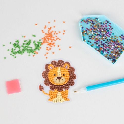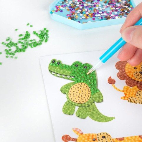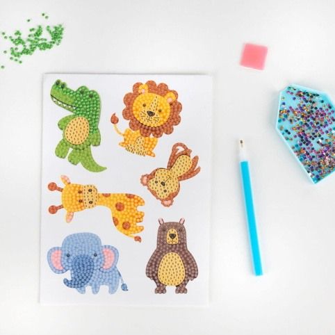 Diamantové nálepky KIDEA s motivy zvířátek. Nalepování podle čísel. Sada obsahuje 6 nálepek: slona, krokodýla, lva, lišku, tygra a mývala, 500 diamantů v 9 různých barvách, aplikátor, tácek a vosk. Po dokončení je dílo vhodné k nalepení na hladké předměty. Například lednička, okno, sešit atp.