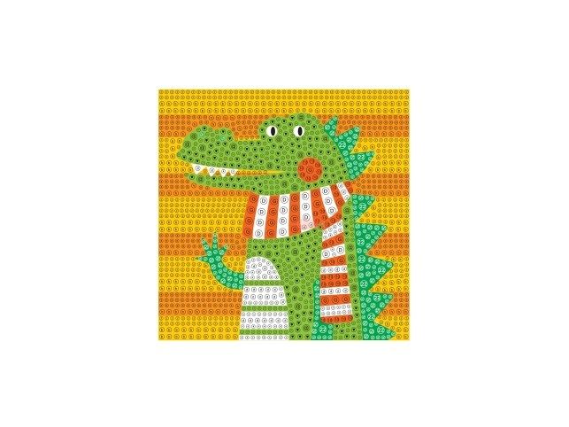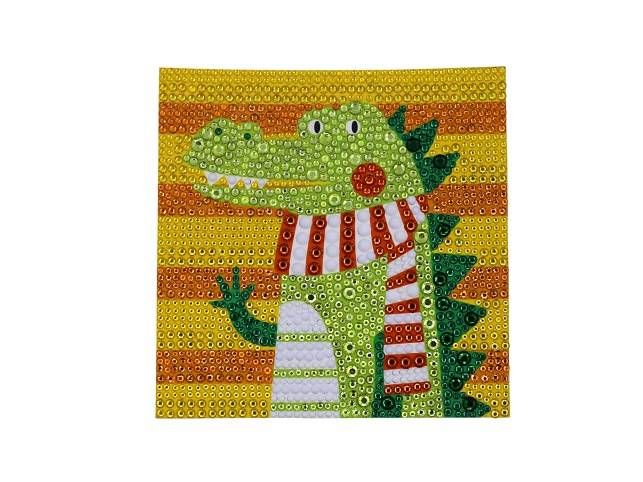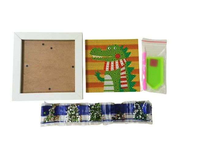 Diamantové tvorení s motivem krokodýla obsahuje barevnou predlohu, bílý rámecek, barevné diamanty, pero na aplikaci diamantu, silikonový gel a misku. Po odlepení pruhledné ochranné fólie ze šablony se pomocí aplikacního pera a silikonového gelu nanášejí diamanty na odpovídající místa. Tvorení podporuje jemnou motoriku, trpelivost a rozvíjí kreativitu. Hotový obrázek v rámecku se stane krásnou dekorací.