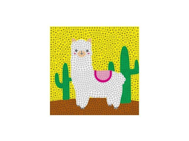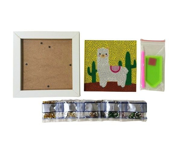 Diamantové tvorení s motivem lamy obsahuje barevnou predlohu, bílý rámecek, barevné diamanty, pero na aplikaci diamantu, silikonový gel a misku. Po odlepení pruhledné ochranné fólie ze šablony se pomocí aplikacního pera a silikonového gelu nanášejí diamanty na odpovídající místa. Tvorení podporuje jemnou motoriku, trpelivost a rozvíjí kreativitu. Hotový obrázek v rámecku se stane krásnou dekorací.