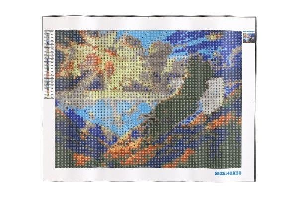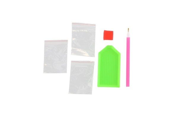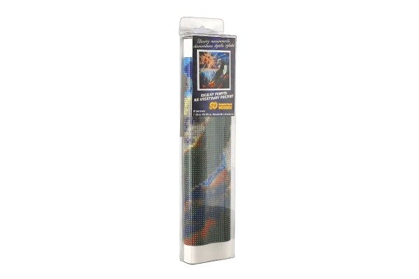 Plátno obsahuje označení, která jsou umístěna i na sáčcích s kamínky, podle označení víte, kam který kamínek patří. Platno o rozměru 40 x 30 cm je baleno ve srolovaném tvaru. Balení obsahuje: plátno s předtištěným obrázkem, pero na aplikaci kamínků, kalíšek na vysypání kamínků, vosk na nalepení, sadu kamínků - od každé barvy jeden sáček.