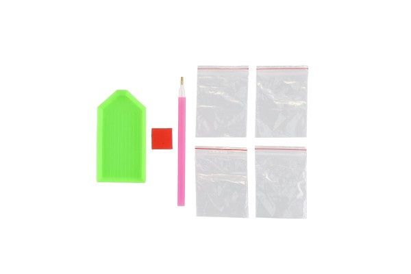 Plátno obsahuje označení, která jsou umístěna i na sáčcích s kamínky, podle označení víte, kam který kamínek patří. Obrázek je zakrytý ochrannou folií, kterou sundávejte vždy postupně, tak jak budete aplikovat kamínky. Balení obsahuje: plátno s předtištěným obrázkem, pero na aplikaci kamínků, kalíšek na vysypání kamínků, vosk na nalepení, sadu kamínků - od každé barvy jeden sáček.