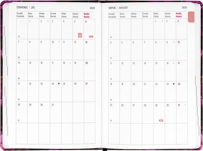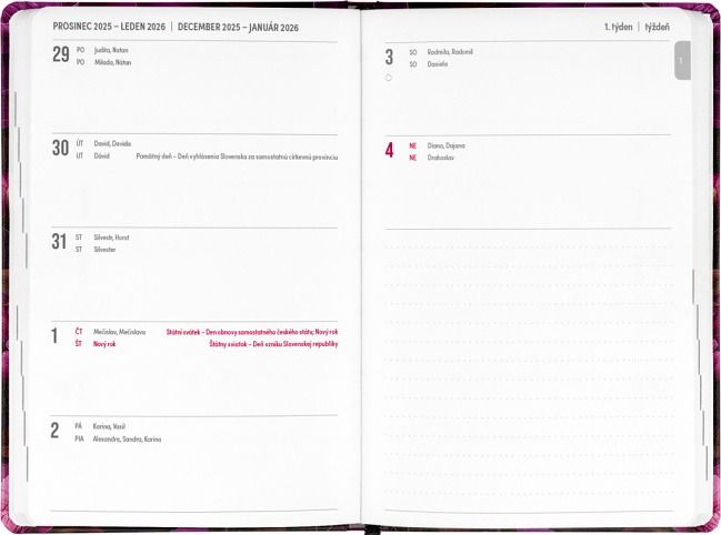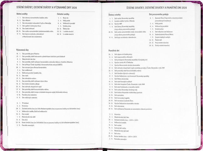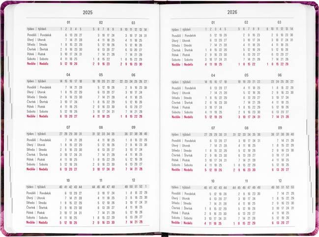 Osmnáctiměsíční diář obsahuje přehled na rok 2025 a 2026, seznam českých a slovenských jmen, česko-slovenské týdenní řádkové kalendárium se jmény a svátky a prostor na poznámky. Kalendárium začíná v červenci 2025 a končí v prosinci 2026.