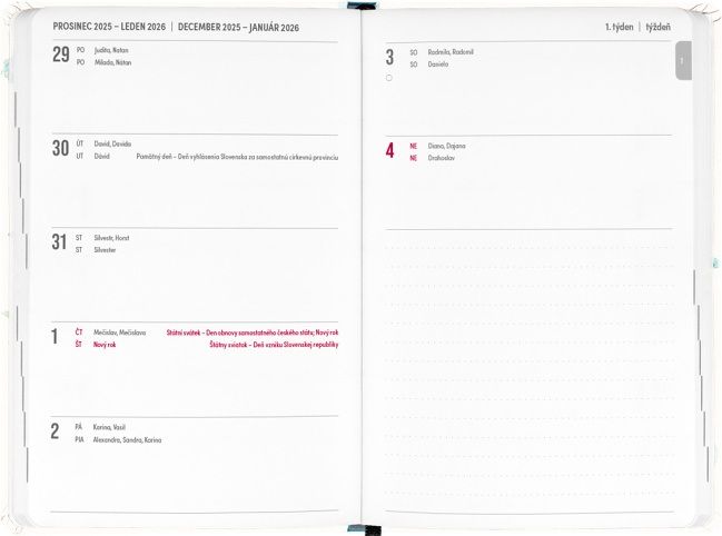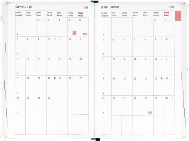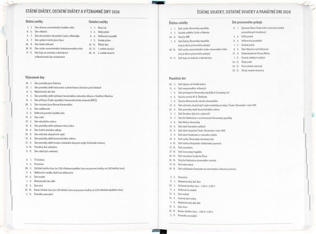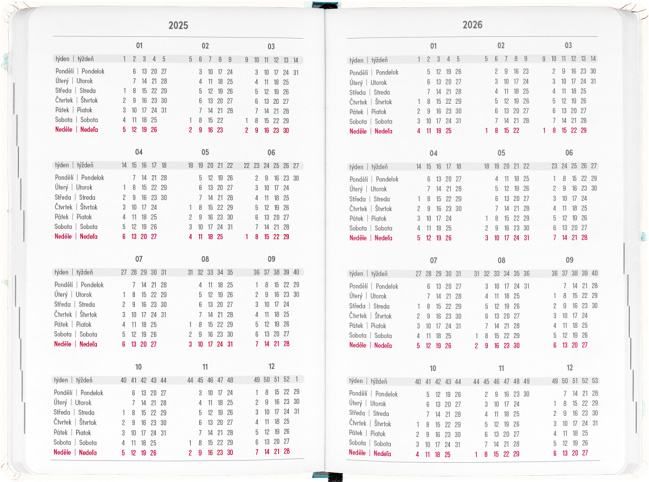 Osmnáctiměsíční diář obsahuje přehled na rok 2025 a 2026, seznam českých a slovenských jmen, česko-slovenské týdenní řádkové kalendárium se jmény a svátky a prostor na poznámky. Kalendárium začíná v červenci 2025 a končí v prosinci 2026.
