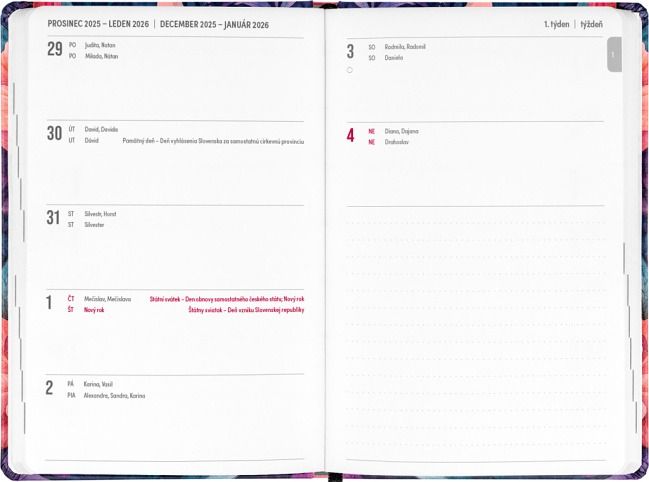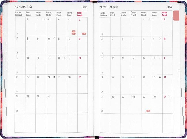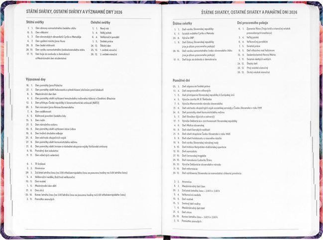 Osmnáctiměsíční diář obsahuje přehled na rok 2025 a 2026, seznam českých a slovenských jmen, česko-slovenské týdenní řádkové kalendárium se jmény a svátky a prostor na poznámky. Kalendárium začíná v červenci 2025 a končí v prosinci 2026.