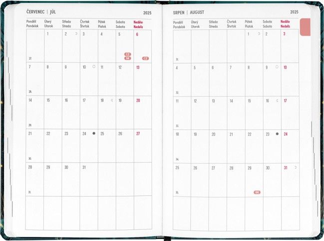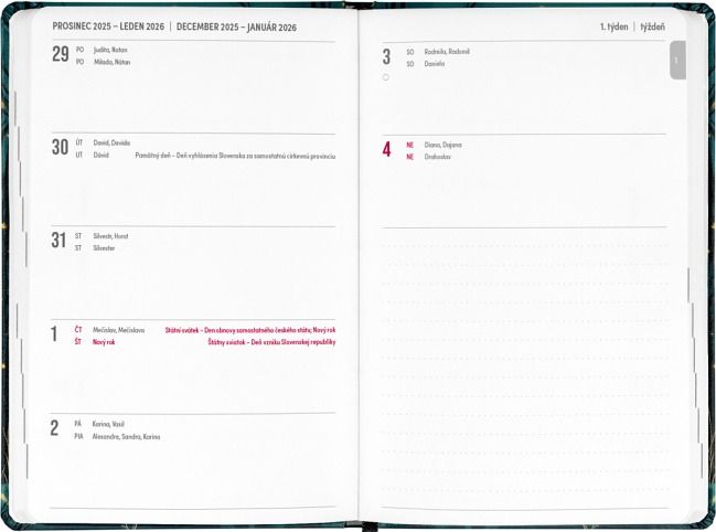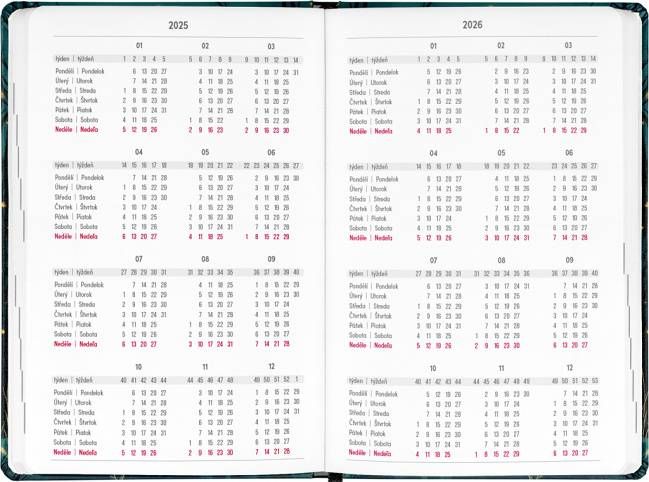 Osmnáctiměsíční diář obsahuje přehled na rok 2025 a 2026, seznam českých a slovenských jmen, česko-slovenské týdenní řádkové kalendárium se jmény a svátky a prostor na poznámky. Kalendárium začíná v červenci 2025 a končí v prosinci 2026.