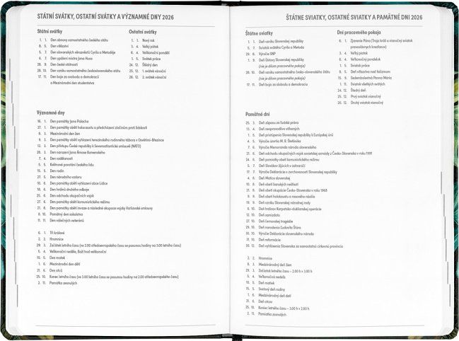 Osmnáctiměsíční diář obsahuje přehled na rok 2025 a 2026, seznam českých a slovenských jmen, česko-slovenské týdenní řádkové kalendárium se jmény a svátky a prostor na poznámky. Kalendárium začíná v červenci 2025 a končí v prosinci 2026.