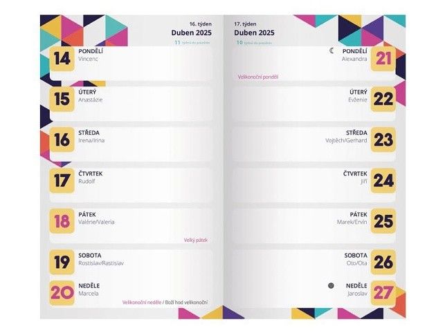 Školní diář týdenní 2024/2025. Pořiďte svým dětem barevný školní diář, který je výborným pomocníkem pro organizování jak školních povinností, tak i mimoškolních aktivit. Diář je k dispozici ve 2 provedeních. Desky diáře jsou vyrobeny z lamina. DIÁŘ OBSAHUJE: - osobní údaje - tísňová telefonní čísla - jednotlivé měsíce - týdny - svátky a významné dny 2024/2025 - abecední seznam jmen - přehled roku 2024/2025 - plánovací kalendář 2024/2025 - poštovní směrovací čísla ČR - mapu ČR - kilometrové vzdálenosti ČR a SR, Evropy - malá násobilka - vyjmenovaná slova - geometrické vzorce - cizí jednotky a měny - časová pásma - prostor na poznámky - rozvrh hodin - městské části Prahy Vazba: šitá V1 Materiál: lamino Počet stran: 72 Uvedená cena je za 1 ks.