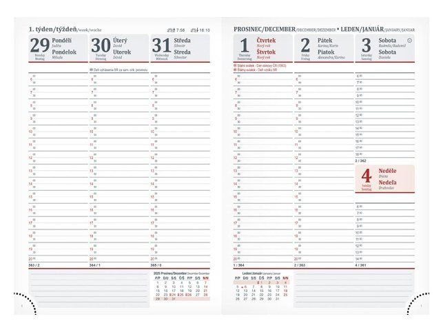 Čas pod kontrolou! Modrá obálka s jemnou strukturou a výrazným reliéfem v horní části zaujme hned na první pohled. Žádné kompromisy mezi vzhledem a funkčností – tenhle diář to zvládá obojí. Formát A5 vám nabídne dost místa na všechno důležité, co si potřebujete poznamenat. Měkčený PU povrch je příjemný na dotek a zároveň dostatečně odolný, aby s vámi zvládl celý pracovní rok – každý den. Součástí diáře jsou také odtrhávací rožky, které usnadní orientaci a pomohou vám rychle najít aktuální týden. DIÁŘ OBSAHUJE: - roční přehled roku - plánovací kalendář - čtvrtletní plánovací kalendář - abecední seznam jmen - státní svátky - mezinárodní svátky - 7 stran pro poznámky - mapy - jmenné kalendárium - číslování týdnů - státní svátky a významné dny - východy a západy Slunce - fáze měsíce - letní a zimní čas - znamení - přehled dvou měsíců Barva: modrá Vazba: šitá V8 Rozsah: 144 stran Rozměr: 140 × 205 mm Povrchy a zpracování obálky: PU Kalendárium: československé týdenní Uvedená cena je za 1 ks.
